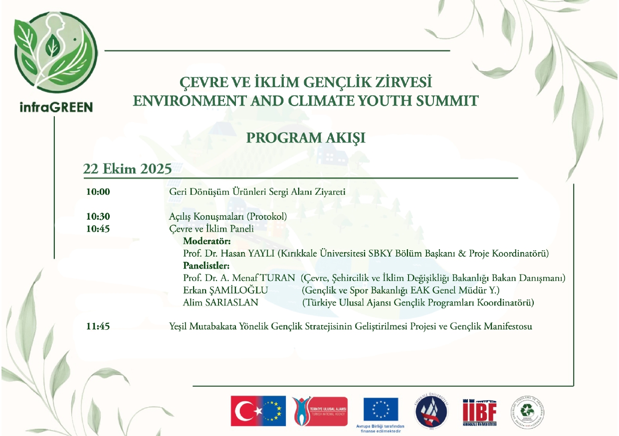 Avrupa Birliği tarafından finanse edilen ve Türkiye Ulusal Ajansı tarafından desteklenen “Yeşil Mutabakata Yönelik Gençlik Stratejisinin Geliştirilmesi (infraGREEN)” projesi kapsamında düzenlenen Çevre ve İklim Gençlik Zirvesi, çevre bilincinin artırılması ve yeşil dönüşüm vizyonunun yaygınlaştırılmasını hedefliyor.